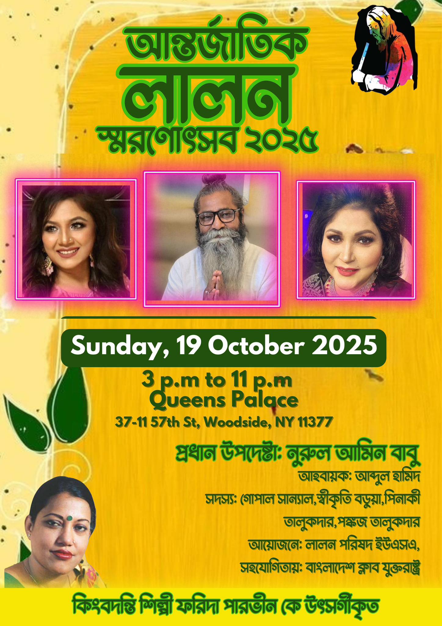 Read Moreআধ্যাত্মিক সাধক, মানবতাবাদী, সমাজ সংস্কারক এবং দার্শনিক মহাত্মা লালন সাঁই কে স্মরণ করে আন্তর্জাতিক লালন স্মরণোৎসব ২০২৫ এর আয়োজন করছে, যেখানে মিলবে সংগীত, নৃত্য ও আলোচনার এক অপূর্ব মেলবন্ধন। তারিখ: ১৯শে অক্টোবর, ২০২৫ সময়: বিকাল ৩টা হইতে রাত ১১টা স্থান: ৩৭-১১, ৫৭ স্ট্রীট, উডসাইড, কুইন্স প্যালেস, নিউইয়র্ক, আমেরিকা বিশেষ সংগীতানুষ্ঠানে পরিবেশন করবেন: কিংবদন্তি শিল্পী শফি […]